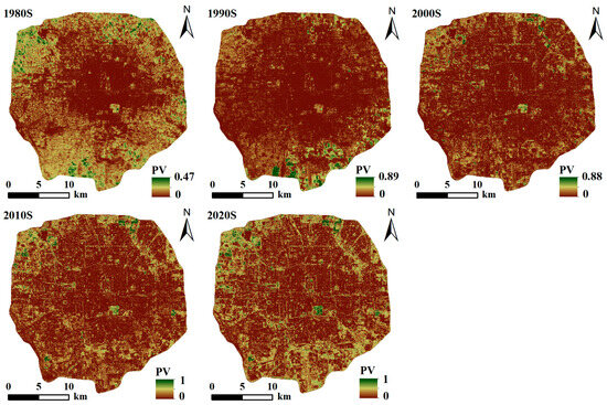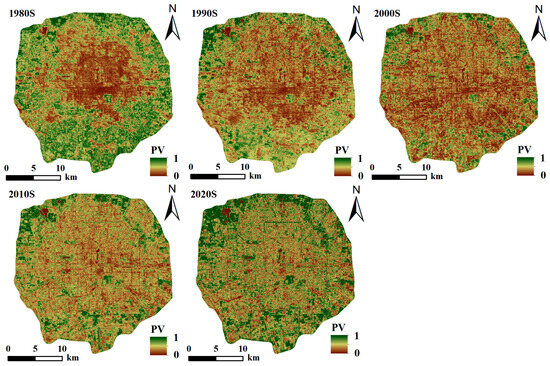 This study examines the evolution of UGS distribution in Beijing from the 1980s to the 2020s using summer and winter PV data. Figure 5 shows limited UGS coverage in the city center during the 1980s, mainly in major parks such as Tiantan [Temple of Heaven] and Ditan [Temple of Earth], while high vegetation indices were mainly along the Fourth–Fifth Ring Road interzone. In the 1990s and 2000s, central UGS coverage increased modestly but decreased significantly between the Fourth and Fifth Ring Roads. Since the 2010s, UGS distribution has become more decentralized, with a notable recovery in the Fourth–Fifth Ring Road corridor. Overall, UGS within Beijing’s Fifth Ring Road experienced two main phases: (1) a decline from the 1980s to the 2000s driven by rapid urbanization replacing UGS with impervious surfaces; and (2) a recovery from the 2010s to the 2020s linked to urban stabilization, functional improvements, and better public infrastructure. This resurgence is especially strong in Chaoyang, Haidian, and Dongcheng districts—key areas for modern service industries. The pre-Olympic greening initiatives in 2008 further significantly expanded urban green coverage.
