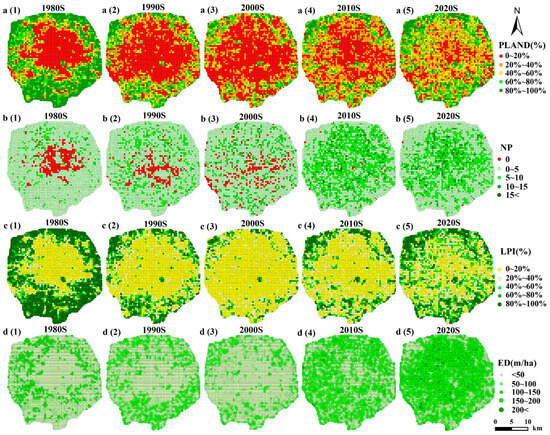 Analysis of green space landscape metrics at a 500 m spatial scale (Figure 7) reveals distinct spatiotemporal variations in four key indices, signifying dynamic pattern changes during rapid urbanization. The green landscape followed an “initial fragmentation → gradual restoration” trajectory. From the 1980s to 2000s, urban core PLAND declined continuously while NP increased sharply, indicating intensified fragmentation. Concurrently, decreasing LPI and fluctuating ED (initial increase followed by a decrease) signified greater patch segmentation and structural complexity. Since the 2010s, PLAND recovery with concurrent NP, ED, and LPI increases reflects landscape expansion, reconnection, and integration. Green infrastructure development during this period enhanced ecological spatial structure, improving connectivity and stability.
