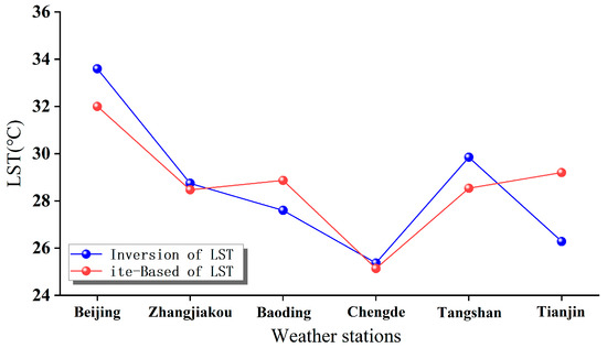To improve data accuracy and enhance the scientific rigor of subsequent analyses, the retrieved LST data were validated against ground-based observations. Meteorological data were obtained from six national standard meteorological stations within North China, including sites in Beijing, Tangshan, Baoding, Chengde, and surrounding regions. As part of China’s national meteorological observation network, these baseline stations feature long-term monitoring records and stable operational protocols, ensuring high data accuracy. Consequently, their observations serve as reliable references for evaluating the accuracy of LST retrievals.