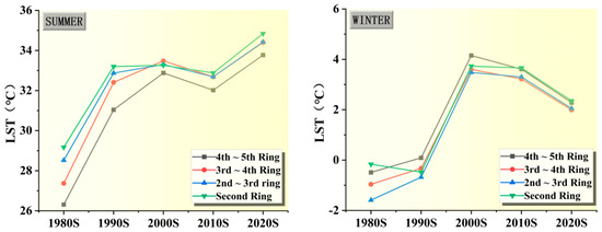 Figure 9 presents the temporal trends of mean LST during summer and winter across distinct ring road zones in Beijing (specifically, the Fifth, Fourth, Third, and Second Ring Roads). Over the past four decades, summer LST in all zones exhibited a generally increasing trend with fluctuations, rising overall by approximately 6–8 °C. The most rapid increase occurred from the 1980s to the 2000s, followed by a reduced rate of warming between the 2000s and 2010s. Conversely, winter LST displayed a more complex pattern, characterized by a three-phase trend: initial increase, subsequent stabilization, and eventual slight decline. Notably, temperature differences among zones during winter were smaller than those observed in summer.