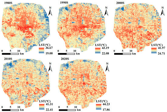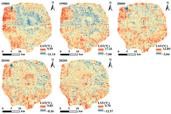 Figure 10 illustrates the marked spatiotemporal heterogeneity and dynamic evolution of Beijing’s thermal environment over the past four decades. Temporally, LST exhibited continuous warming from the 1980s to the 2020s. Temperature peaks in high-temperature zones consistently exceeded 40 °C since the 1990s, reaching a maximum value of 44.23 °C in the 2020s. The warming rate varied interdecadally: rapid growth during the 1980s–1990s coincided with substantial expansion of high-temperature areas; moderated growth in the 2000s; a slight decline in the 2010s; and a resurgence in the 2020s. Spatially, the 1980s featured concentrated, contiguous high-temperature zones primarily within the Third Ring Road, forming a single thermal core. These zones subsequently expanded outward with decreasing spatial concentration. By the 2020s, high-temperature areas exhibited a polycentric, dispersed pattern featuring independent thermal patches in both central urban areas and suburban development zones. This transition from centralized to dispersed UHI patterns reflects urban expansion and polycentric land-use development.