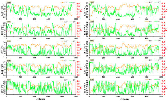 3.3.1. Spatiotemporal Variation in LST and UGS Along Profile Lines in Urban Areas