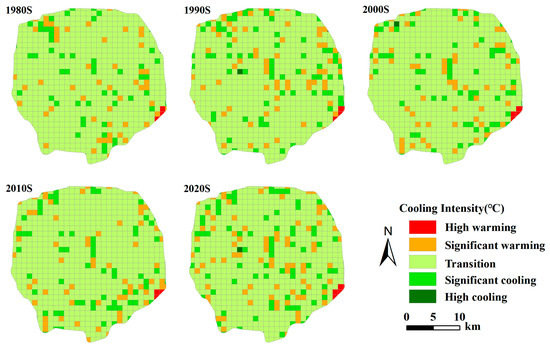 To assess interannual variation in UGS cooling effects, this study performed a cross-decadal comparative analysis of thermal regulation performance within fixed 1 km × 1 km grid cells (Table 3). Findings indicate short-term changes were predominantly ‘transition’ type (>50% per interval), peaking at 76.9% during 2010s–2020s. This demonstrates moderate inter-period stability in cooling capacity for most grids. ‘Enhancement’ grids remained limited in short-term intervals (typically 17–21%), contrasting with the 1980s–2020s long-term proportion of 25.4%. This suggests minimal short-term improvements but moderate long-term enhancement. ‘Weakening’ grids maintained a low proportion (minimum of 10.7% during 2010s–2020s), suggesting either a relatively stable UGS structure throughout this phase or a limited impact of urban expansion on the cooling capacity of UGS.