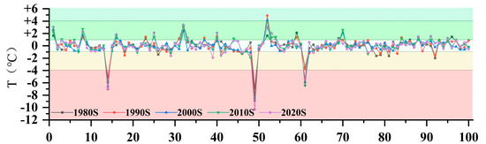 Compared to the 1980s, more grid cells exhibited pronounced cooling capacity in the 2020s, with increased spatial homogeneity in their distribution. Analysis of summer vegetation coverage (Figure 5) reveals declining and increasingly fragmented green spaces at urban fringes over four decades, yet overall distribution has trended toward greater uniformity. This implies that large UGS patches alone are insufficient for optimal cooling. An integrated approach considering spatial configuration, adjacent land-use, and anthropogenic activities is essential. As shown in Figure 14, among the 100 randomly sampled points, most grid cells maintain a stable cooling intensity throughout all periods, within a range of ±1 °C, with only a few exceptions showing significant warming. Crucially, cooling peaks consistently outnumbered warming peaks, confirming UGS predominantly cooled local environments rather than contributing to warming. This provides robust evidence of UGS’s sustained role in mitigating summer UHI effects.