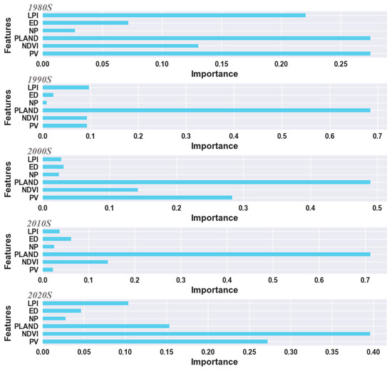 To systematically elucidate the relationship between LST variation and landscape patterns, feature importance analysis was conducted using XGBoost models across distinct temporal periods. As illustrated in Figure 15, the PLAND consistently demonstrated the highest feature importance from the 1990s to the 2010s, indicating that UGS proportion was the decisive predictor of LST variations during these decades. LPI was also relatively prominent only in the 1980s, highlighting the dominant role of large green patches in the early urban landscape configuration. By the 2020s, the importance of the NDVI and PV substantially increased, reflecting the growing influence of vegetation quality on environmental regulation. This shift signifies decreasing reliance on single-metric area indicators and a transition toward integrated consideration of vegetation condition and spatial configuration. Such evolution likely corresponds with advances in refined UGS management and ecological restoration technologies. Collectively, these findings reveal a clear transition in urban ecosystems: from a primary focus on UGS quantity toward an emphasis on UGS quality.