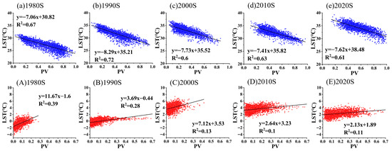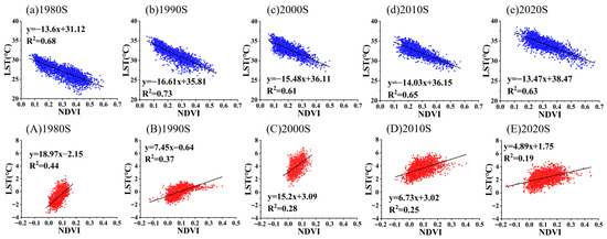 Linear relationships between NDVI and LST in different periods. (a–e) represent the summer NDVI–LST linear relationships for each period; (A–E) represent the winter NDVI–LST linear relationships for each period.