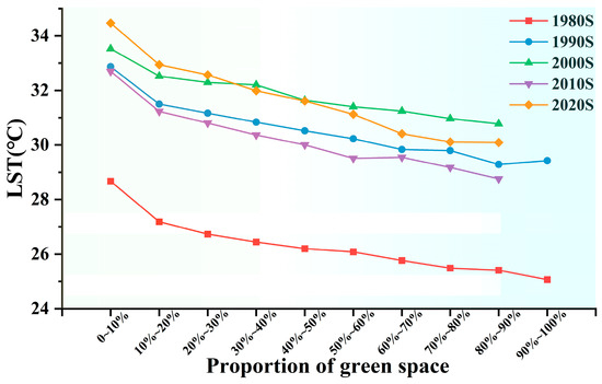 Figure 12 displays the spatiotemporal variations in LST and PV. A distinct inverse relationship exists between LST and PV: areas with high PV values (dense vegetation) exhibit lower surface temperatures, while areas with low PV (built-up/bare surfaces) display significantly elevated temperatures, demonstrating UGS cooling capacity. Temporally, LST shows a general increasing trend with growing thermal fluctuations over decades. PV values underwent more pronounced changes, reaching near-maximum values (PV ≈ 1) in numerous areas during the 2020s. This indicates that despite increased fragmentation of green spaces, enhanced vegetation vigor within individual patches demonstrates effective urban greening implementation with robust thermal regulation capabilities. This study confirms a robust inverse correlation between UGS and LST during summer, demonstrating substantial spatiotemporal UGS evolution impacts on urban thermal environments.