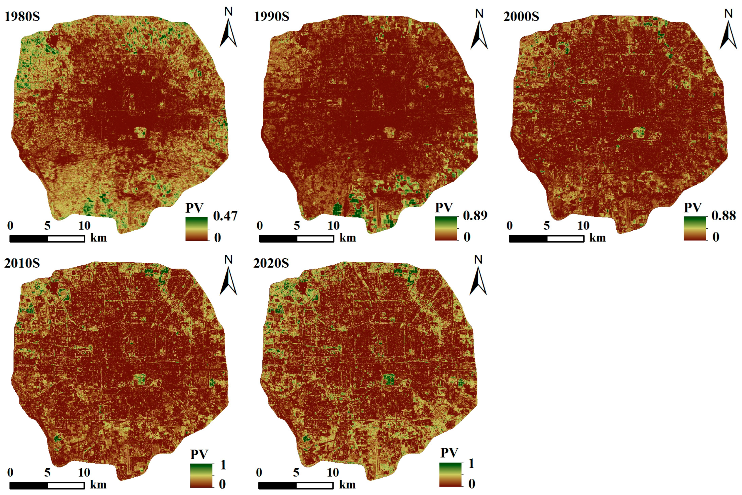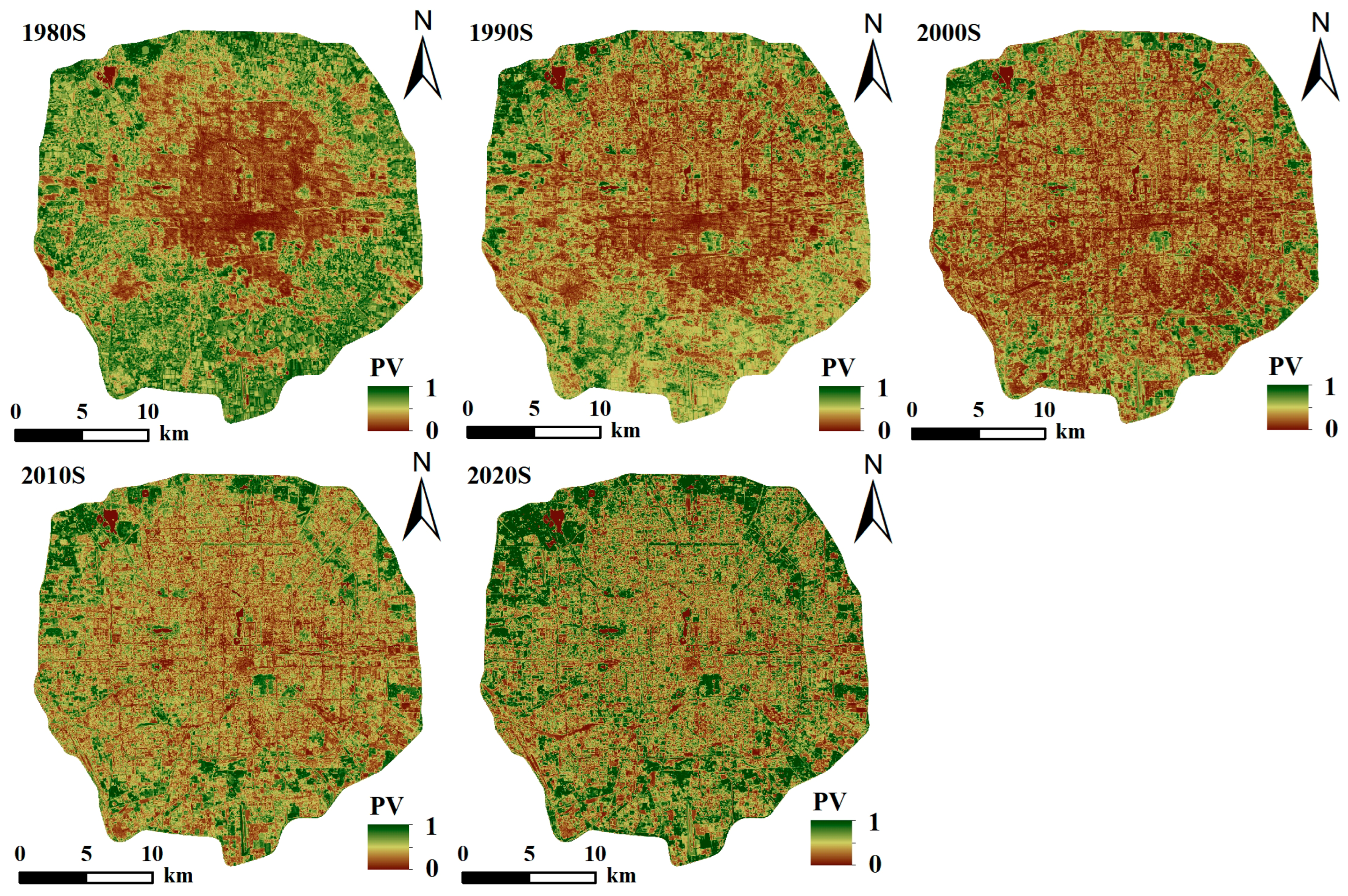 - Phased fluctuations in cooling effectiveness: Accelerated urbanization has intensified the fragmentation of UGS inside the Fifth Ring Road, with a clear shift in spatial configuration from continuous patches to fragmented and isolated units. Concurrently, the cooling capacity exhibited distinct phased fluctuations, characterized by an “enhancement–decline–re-enhancement” trajectory. In the temporal comparison, the proportion of grids with an enhanced cooling effect consistently remained over 10% higher than in the preceding period. This trend was notably pronounced during the 1990s–2000s, with the proportion reaching 20.5%.