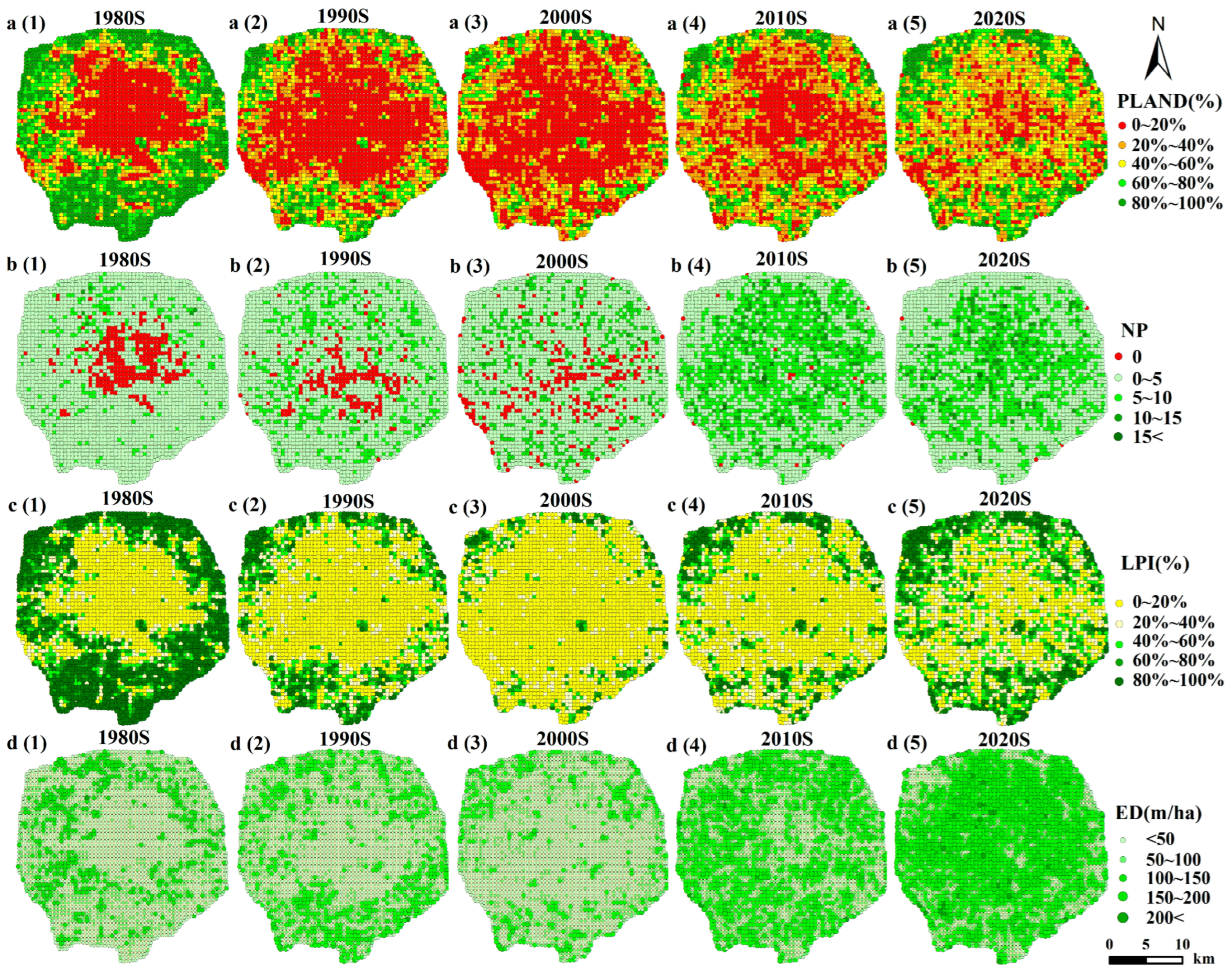 | Number of Patches (NP) | : Refers to the total number of patches in a given landscape type (e.g., green space, forest land, construction land, etc.). | |
