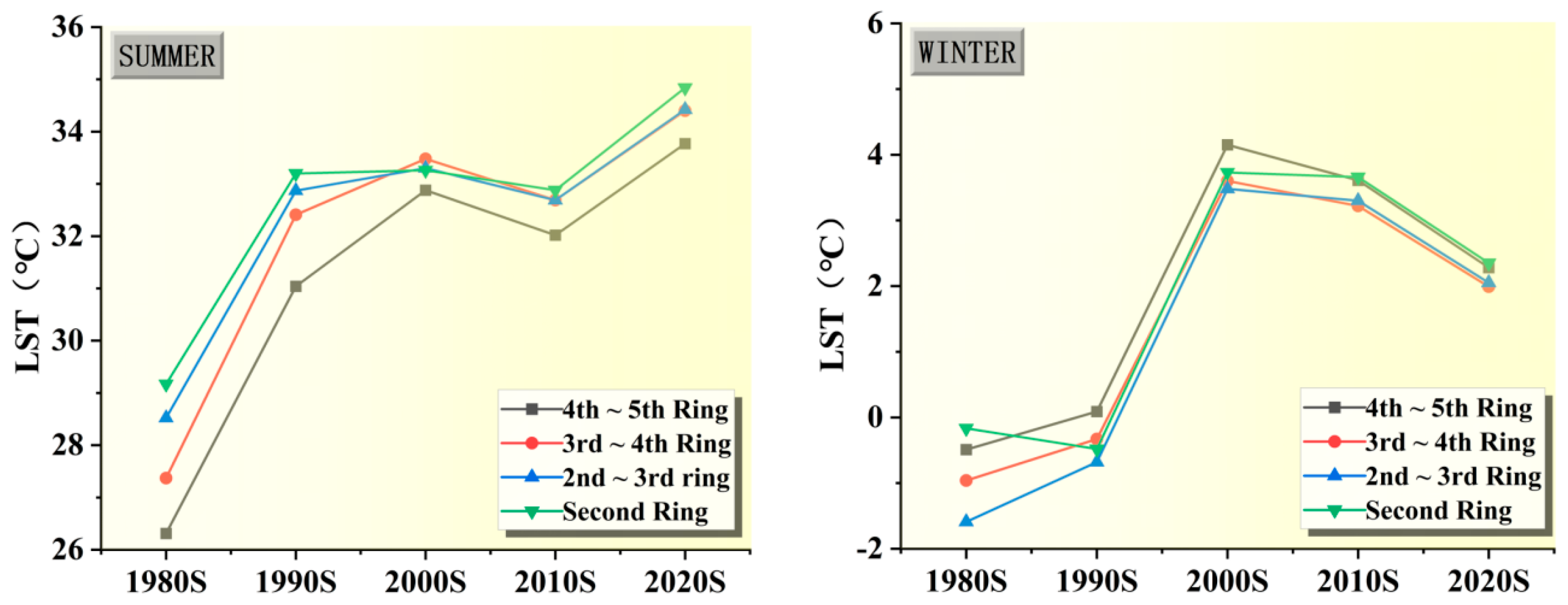 3.2.2. Temporal Trends of LST Across Beijing’s Ring Roads