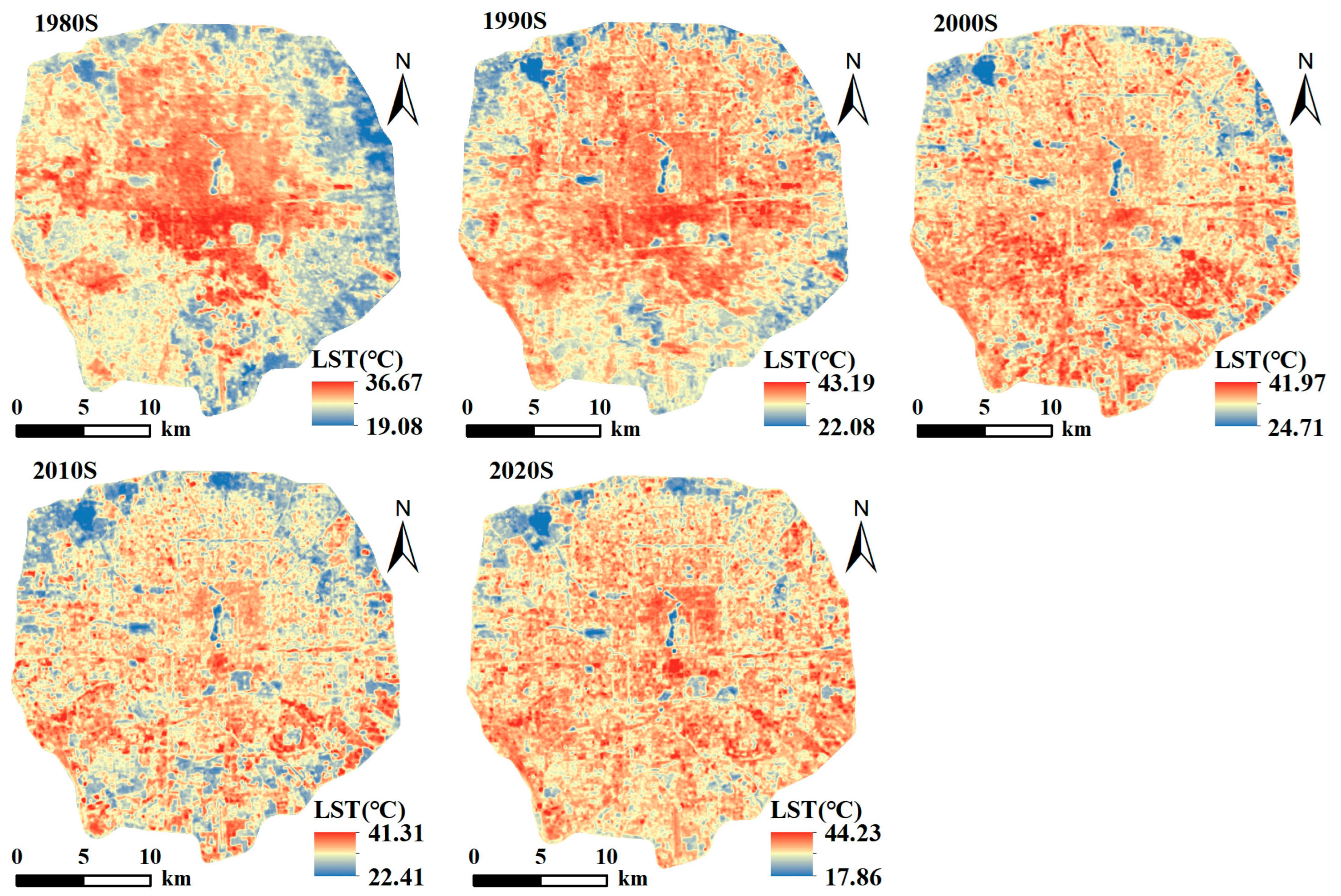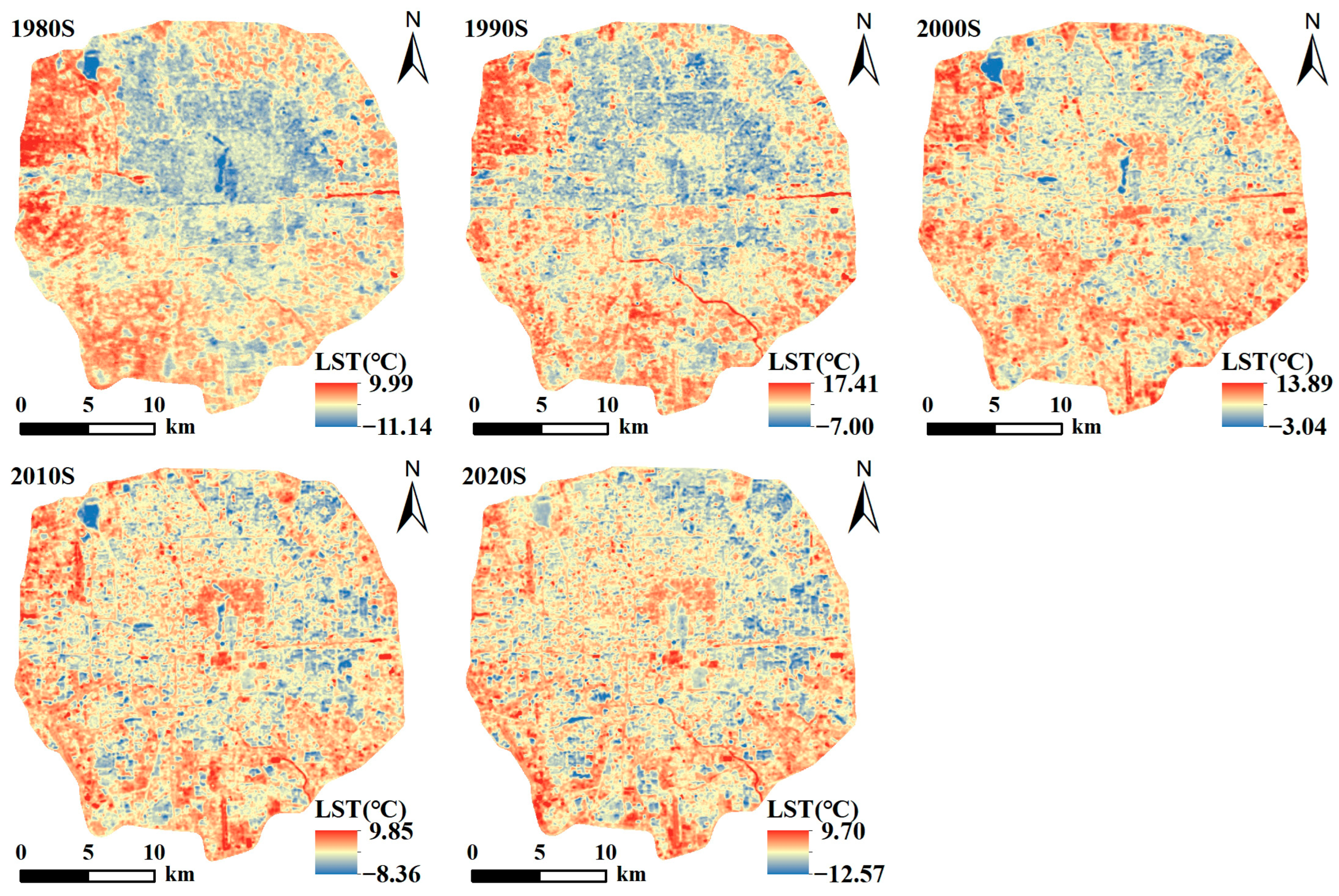 - Zhang, M.; Huang, L.; Jiang, W.; Fan, M.; Dai, W.; Han, W.; Xu, Q.; Dong, Y. Urban core greening and industrial decentralization lead to contrasting trends in surface urban heat islands in a metropolitan area in China. J. Environ. Manag. 2025, 374, 124045. [Google Scholar] [CrossRef] [PubMed]