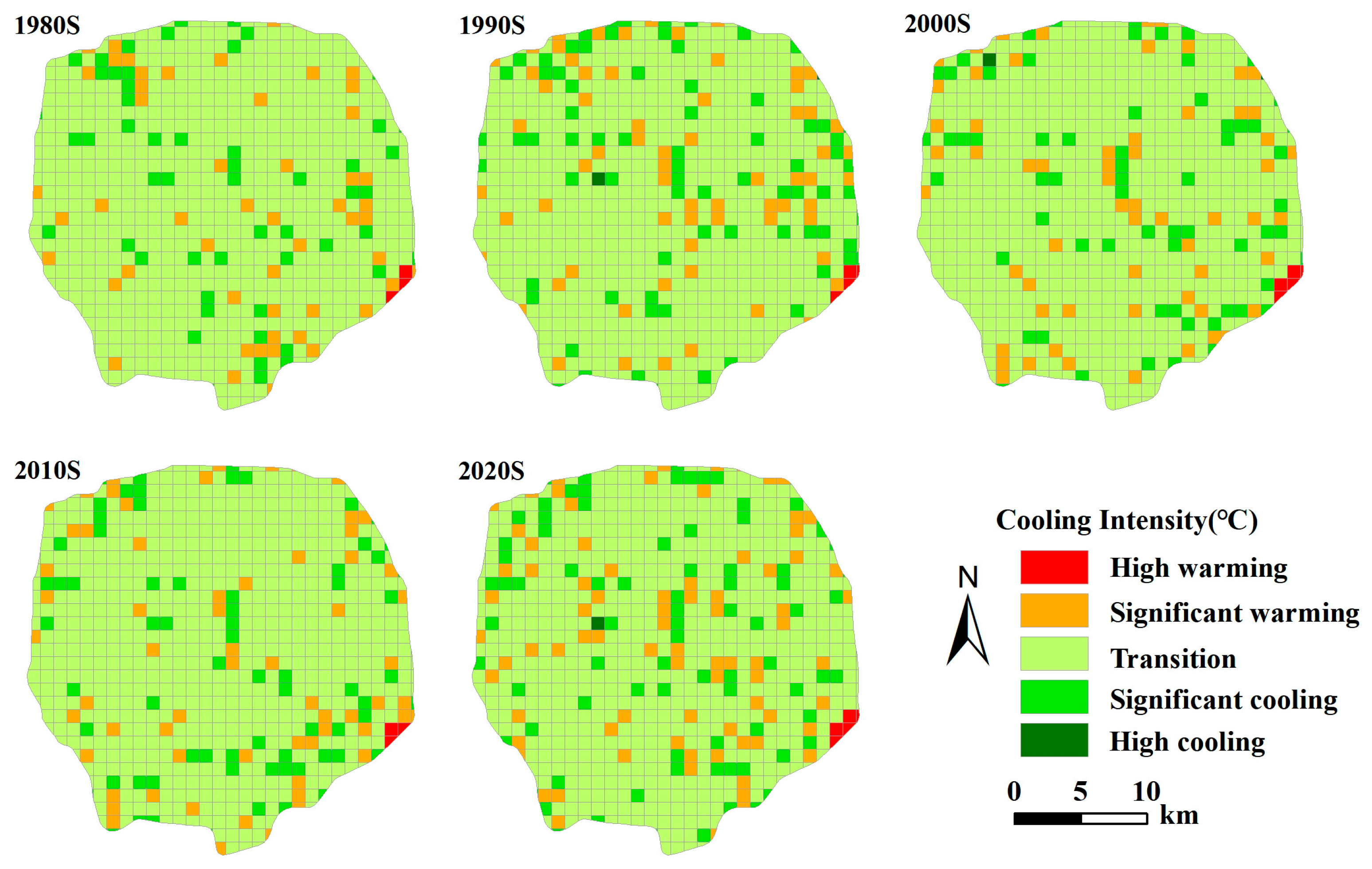 3.3.2. Spatial Pattern Changes in UGS Cooling Capacity
