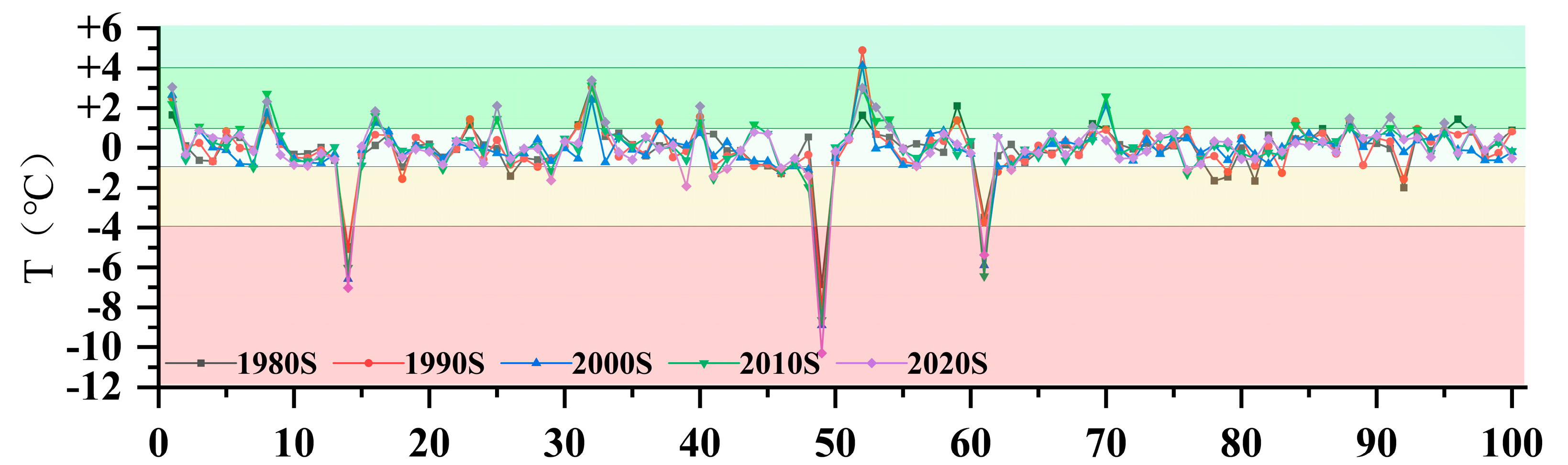 3.2.3. Spatiotemporal Heterogeneity of LST