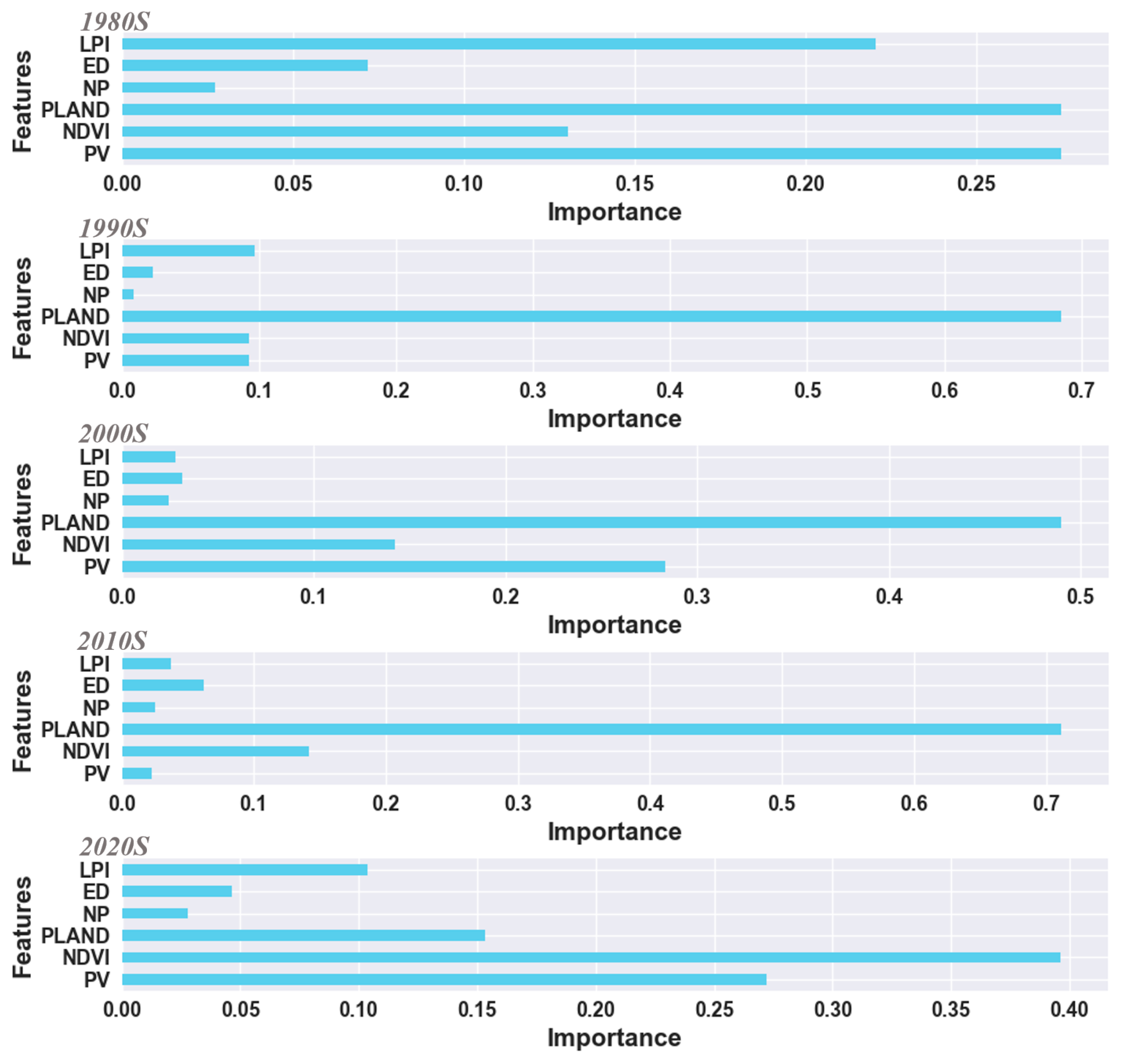 - Spatiotemporal dynamics of landscape pattern: Urbanization has not only altered the spatial distribution of UGS but also reshaped its landscape pattern characteristics. Importance analysis based on the XGBoost model revealed significant temporal heterogeneity in the key indicators governing the cooling effect of UGS: in the 1980s, landscape-scale metrics (e.g., PLAND, LPI) were dominant, whereas by the 2020s, quality-based metrics (e.g., NDVI) became more influential. This shift indicates that the underlying influencing mechanism has transitioned from “scale-dominated” to “quality-dominated.” Therefore, future urban greening strategies should shift from merely pursuing green space expansion to optimizing spatial configuration and enhancing the ecological quality of vegetation.