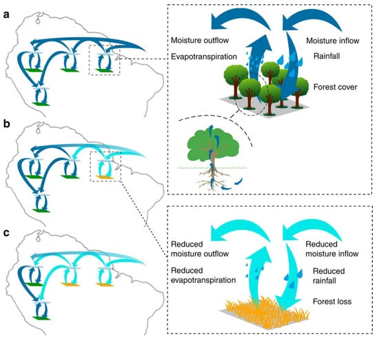 Cascading effects in the vegetation–rainfall system. (a) Vegetation–atmosphere system in equilibrium. (b) Initial forest loss triggered by decreasing oceanic moisture inflow. This reduces local evapotranspiration and the resulting downwind moisture transport. (c) As a result, the rainfall regime is altered in another location, leading to further forest loss and reduced moisture transport. Copyright Nature Communications (2017) [22], CC BY 4.0.