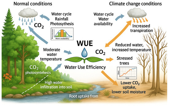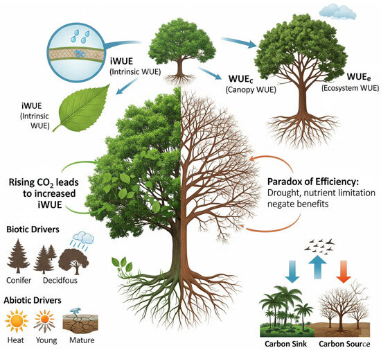 Scope and objectives: This review synthesizes advances in carbon–water coupling in forest ecosystems under climate change, using WUE as the unifying metric. We first clarify the mechanistic basis—from stomatal control, mesophyll and hydraulic constraints, and canopy structure to ecosystem fluxes—and how CO2 enrichment, warming, drought, heatwaves, and high vapor-pressure deficit (VPD) alter coupling. We then evaluate methods for assessing forest WUE, including eddy-covariance and sap-flow observations, tree-ring isotopes, remote sensing (e.g., SIF-based photosynthesis proxies), and process-based as well as hybrid modeling, highlighting strengths, limitations, and key sources of uncertainty. Next, we synthesize global assessments and regional case studies to characterize WUE patterns and their climatic/biotic drivers, including legacy effects after extremes. Building on this evidence, we examine management and policy-relevant trade-offs between carbon storage and water yield, and outline how WUE can guide risk-aware, climate-smart forestry.
