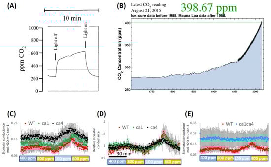 CO2-driven stomatal signaling and closure pathways. (A) Light-driven changes in intercellular CO2 in Vicia faba at ambient 350 ppm, measured with a potentiometric CO2 microprobe inserted through open stomata. (B) Atmospheric CO2 record. (C–E) Effects of CO2 on gas exchange in carbonic anhydrase mutants: raw stomatal conductance. Copyright Cell (2016) [27].