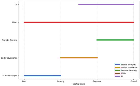 While each approach provides unique insights, their reliability varies substantially across spatial scales and climatic regimes. Figure 5 summarizes the comparative strengths and uncertainties of the major methodologies discussed, highlighting the need for integrated, multi-scale approaches. Horizontal bars indicate the main scales where each method is most reliable, from leaf to global levels.