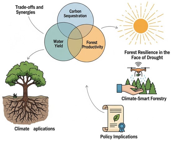 To guide this section, Figure 6 presents a roadmap of sustainability perspectives at the carbon–water nexus. It illustrates the trade-offs and synergies among carbon sequestration, water yield, and forest productivity (Section 5.1); highlights forest resilience under drought and adaptive water-use strategies (Section 5.2); outlines climate-smart forestry options for enhancing carbon–water co-benefits (Section 5.3); summarizes the policy implications for conservation and sustainable resource management (Section 5.4); and introduces governance, equity, and policy frameworks (Section 5.5).