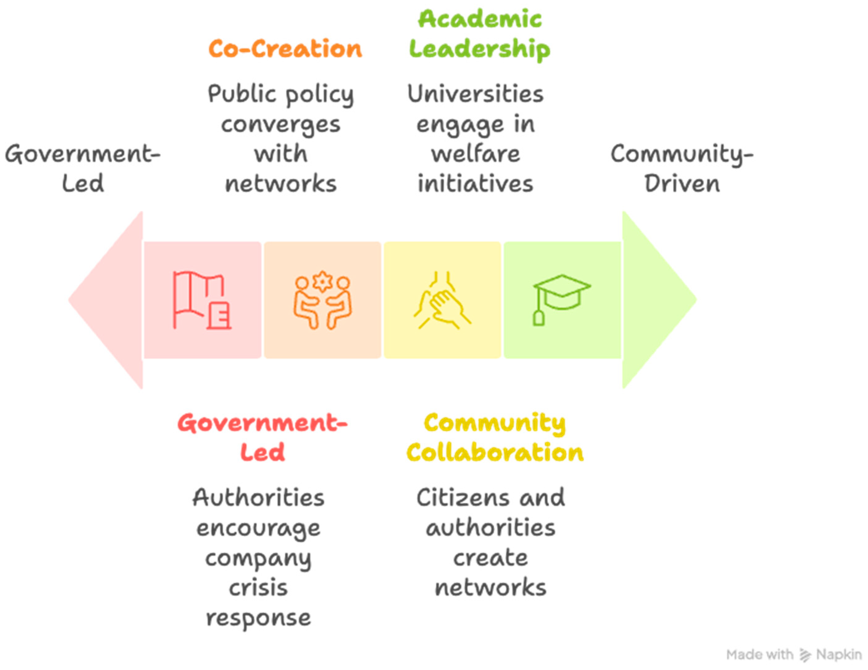 https://www.napkin.ai/). This tool was used to translate thematic categories into accessible visual schemes, ensuring consistency between the analytical dimensions and their graphical representation. The visualizations aim to synthesize complex relationships across cases, highlighting comparative patterns in governance, digital platforms, and community resilience.