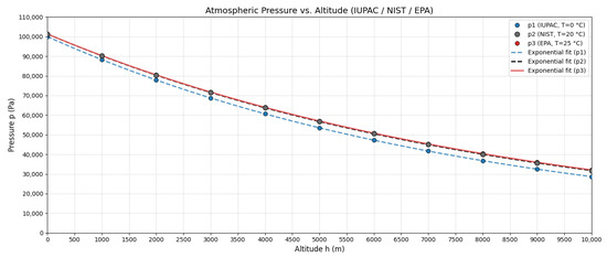 Integration of Equation (6) requires specifying the temperature profile with altitude. For analysis of regulatory standards in the troposphere, where temperature variations (−6.5 °C/km according to [26]) are moderate compared to absolute temperature (∼300 K), the isothermal approximation is adopted. This simplification, used in first-order barometry [32], leads to the exponential solution