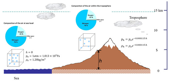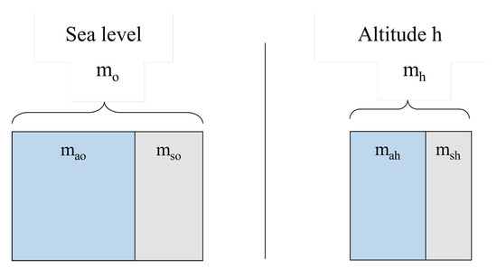 Air is a homogeneous gas mixture [13]. If, additionally, a gaseous pollutant enters a control volume, the gaseous pollutant–air mixture maintains a uniform composition; therefore, any extracted portion is representative of the whole. This physicochemical foundation enables mathematical proportionality between the sea-level case and the case at altitude h. Specifically, if at sea level the ratio between pollutant mass and total mixture mass is , and at altitude h the corresponding ratio is ; the homogeneity of the mixture implies that these ratios are equal: