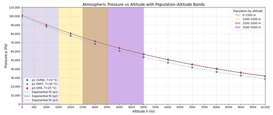 Regulations on atmospheric air quality constitute the primary framework for protecting public health against airborne pollutants globally [1,2,3]. The National Ambient Air Quality Standards (NAAQS) established by the United States Environmental Protection Agency (EPA) and the Air Quality Guidelines (AQG) developed by the World Health Organization (WHO) define concentration thresholds for criteria pollutants that, when exceeded, represent significant health risks. The WHO estimates that 99% of the world’s population breathes air that exceeds guideline values, contributing to more than 6 million premature deaths annually [1,4,5]. Epidemiological evidence demonstrates that exposure to air pollution increases human morbidity and mortality, with spatial and temporal trends in the disease burden attributable to air pollution showing significant variations between regions and periods from 1990 to 2015 [6]. However, the current implementation of these regulatory frameworks assumes uniform applicability in all geographic locations, regardless of altitude. This assumption is problematic because approximately 500 million people, representing 6.58% of the world’s population, reside above 1500 m above sea level (m.a.s.l.), where atmospheric pressure and density differ substantially from sea-level conditions [7]. High-altitude cities such as La Paz, Bolivia (3640 m.a.s.l.), Quito, Ecuador (2800 m.a.s.l.), and Cusco, Peru (3400 m.a.s.l.), apply identical numerical standards to those of coastal cities despite fundamental differences in the atmospheric physics governing the behavior of atmospheric pollutants and human exposure to such pollutants [8,9,10]. This regulatory omission may misrepresent the actual health risks to high-altitude populations and compromise public health protection in these regions. Addressing this gap is essential for achieving equitable environmental governance aligned with the UN 2030 Sustainable Development Goals, particularly SDG 3 (Good Health and Well-being), SDG 10 (Reduced Inequalities), and SDG 11 (Sustainable Cities and Communities) [11,12].