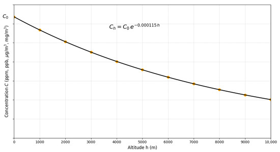 Figure 7 illustrates the fundamental principle of altitude adjustment: for any gaseous pollutant entering the air, concentration decreases exponentially with geographic elevation according to Equation (32). This general relationship is independent of the pollutant type, regulatory framework (EPA, WHO, national regulations), and unit system employed (volumetric such as ppm/ppb or mass-based such as μg/m3/mg/m3), since the factor f is dimensionless and derives exclusively from the variation in atmospheric density with altitude.