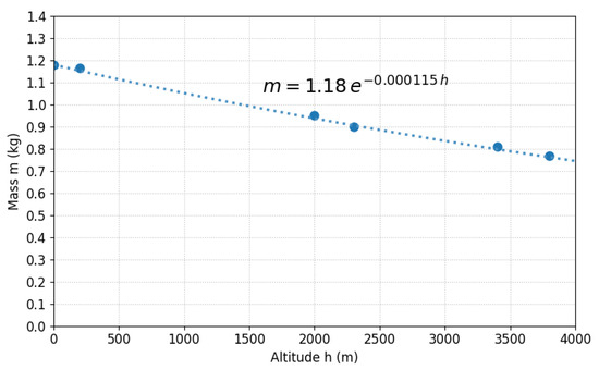 then if we assume that V = 1 m3, the mass at sea level is m0 = 1.20 kg, which means that the air mass as a function of altitude is given by