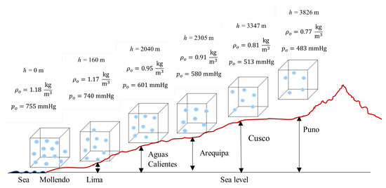 where h is altitude in meters. This factor compensates for the exponential decay of atmospheric density with geographic elevation and preserves gaseous pollutant–air proportionality at different altitudes. Systematic application to the National Ambient Air Quality Standards (NAAQS) of the EPA and the Air Quality Guidelines (AQG) of the WHO showed that, for altitudes of 3500 m (e.g., Cusco, La Paz), adjusted standards should be approximately 67% of nominal values defined at sea level, in order to sustain an equivalent level of health protection. Experimental validation through atmospheric density measurements in six Peruvian cities along 0–3826 m confirmed the consistency of the theoretical model, with relative deviations below 5%, which supports the isothermal approximation employed.