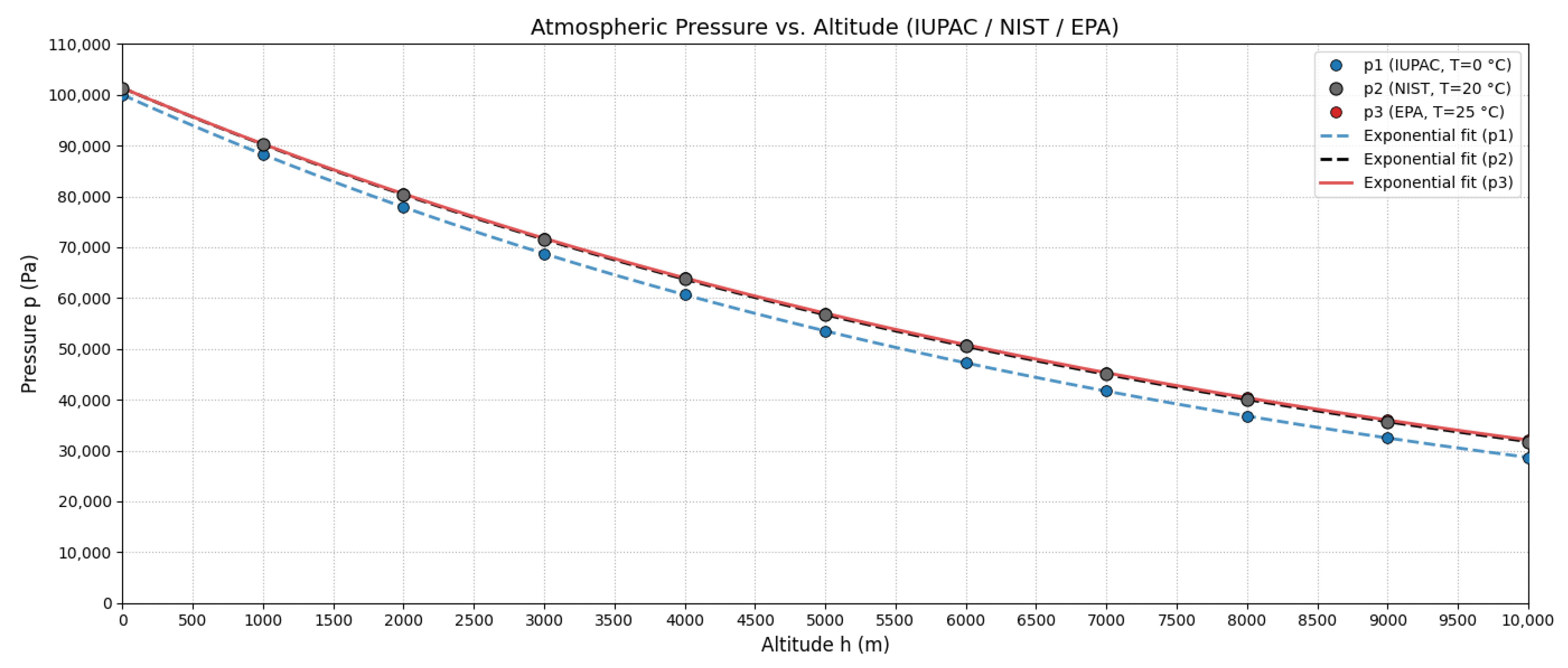 This study addresses this critical gap by deriving a universal altitude adjustment factor for gaseous pollutant air quality standards from first principles of atmospheric physics. Our specific contributions include the following: (1) a rigorous mathematical derivation of the adjustment factor from hydrostatic equilibrium and ideal gas law principles, incorporating standard conditions established by IUPAC, EPA, and NIST; (2) demonstration of the factor’s applicability to gaseous criteria pollutants across different regulatory frameworks (EPA NAAQS, WHO guidelines); and (3) quantification of adjustment magnitudes for representative high-altitude population centers.