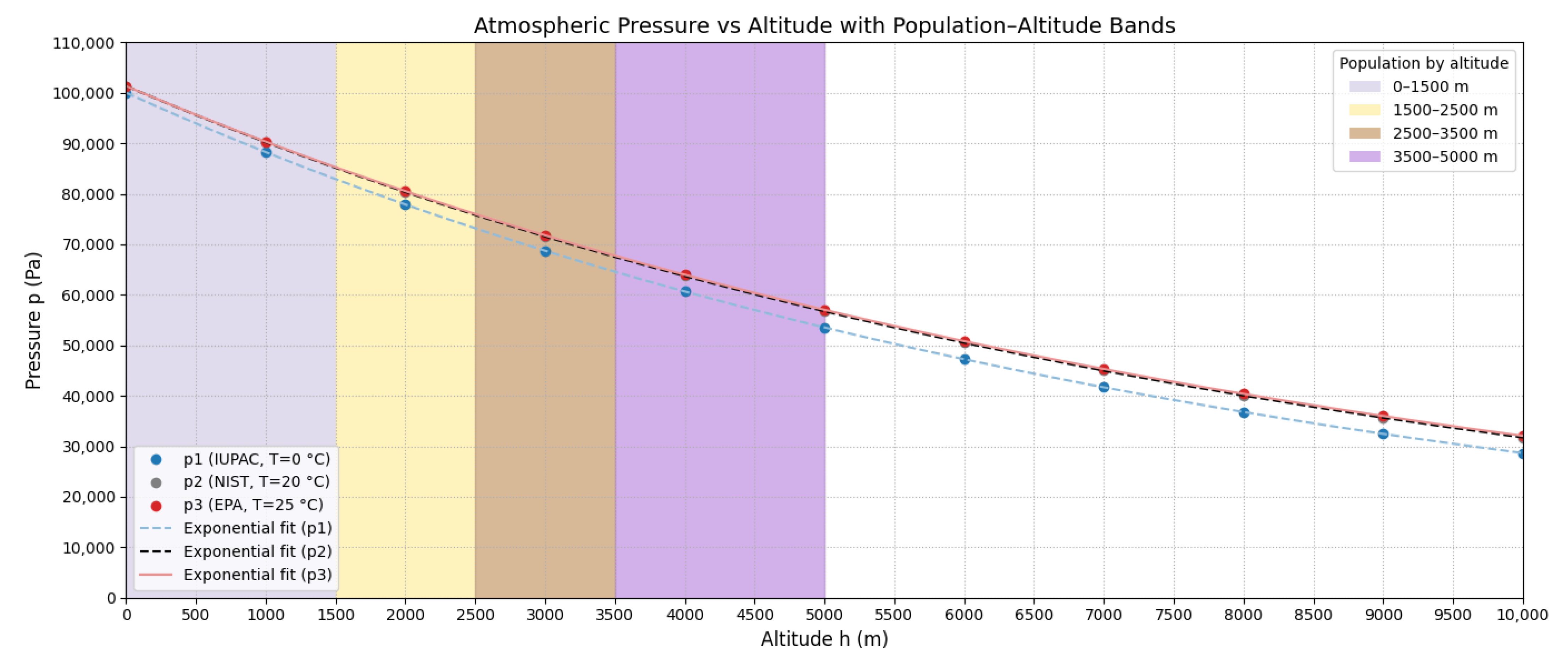 6]. However, the current implementation of these regulatory frameworks assumes uniform applicability in all geographic locations, regardless of altitude. This assumption is problematic because approximately 500 million people, representing 6.58% of the world’s population, reside above 1500 m above sea level (m.a.s.l.), where atmospheric pressure and density differ substantially from sea-level conditions [