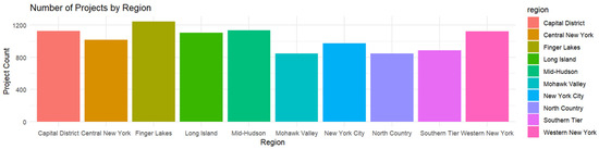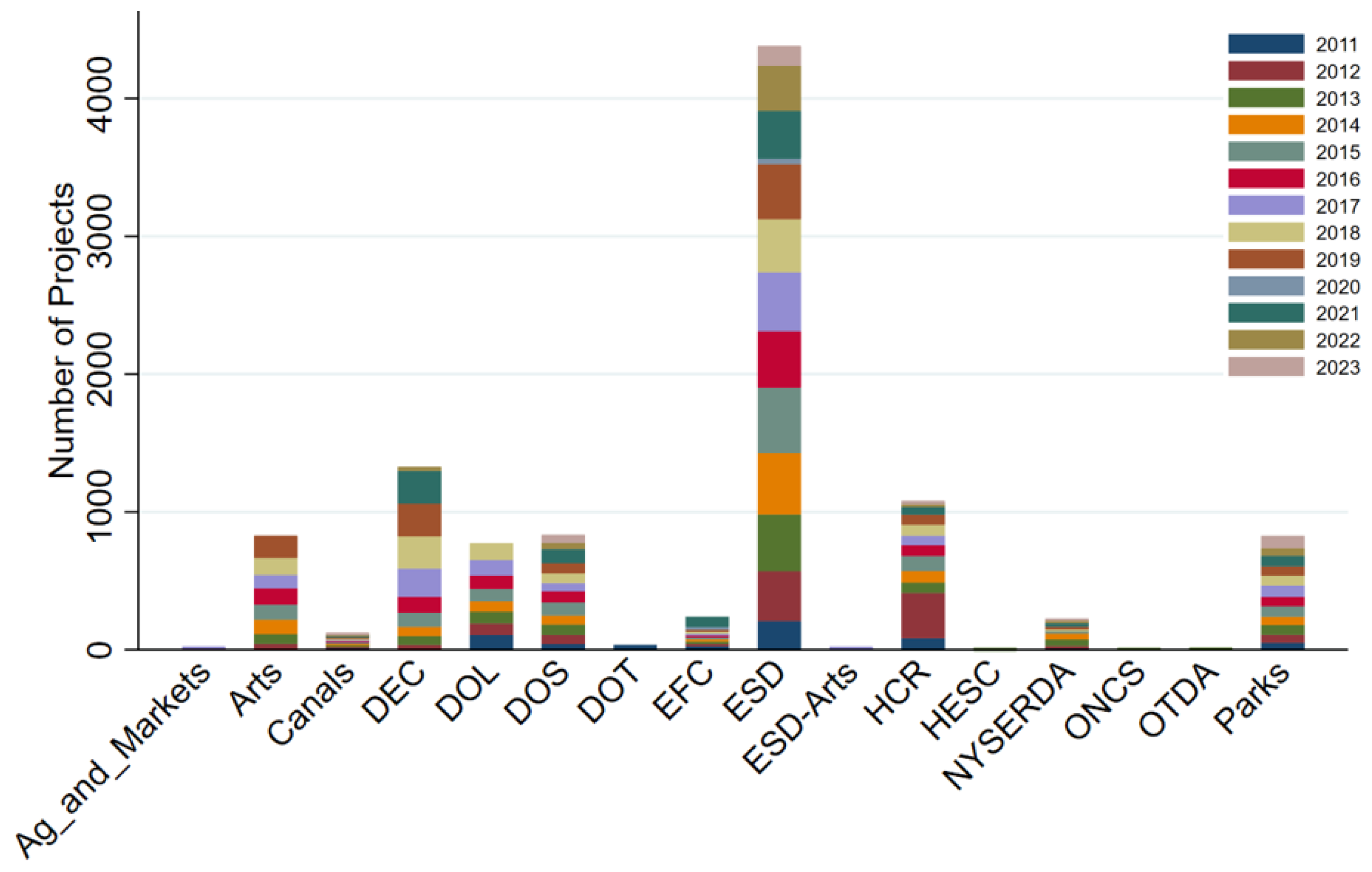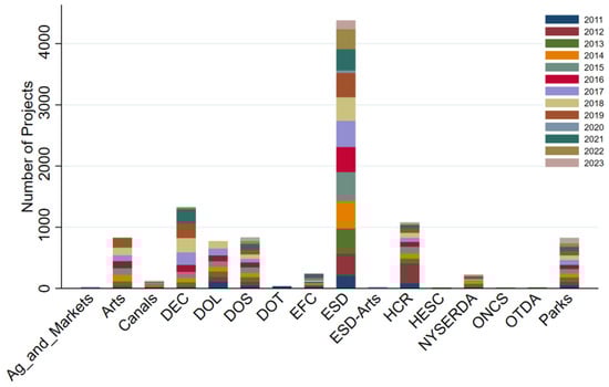 Figure 1 presents the distribution of projects by agency between 2011 and 2023. During this period, a total of 10,734 projects were implemented across 16 state agencies. Among these, the Empire State Development (ESD) agency accounted for the largest number of projects, 4380 projects (40.8%). This was followed by the Department of Environmental Conservation (DEC) with 1327 projects (12.4%), the Homes and Community Renewal (HCR) with 1080 projects (10.1%), and the Department of State (DOS) with 834 projects (7.8%). In contrast, agencies such as the Department of Transportation (DOT), Agriculture and Markets, and the Office of Temporary and Disability Assistance (OTDA) accounted for less than 1% each. Overall, the results show that project implementation from 2011 to 2023 was highly concentrated within a few major agencies, particularly ESD, DEC, and HCR.