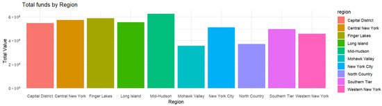 REDC funding in New York State distributed over regions as measured by total funding, 2011–2022.