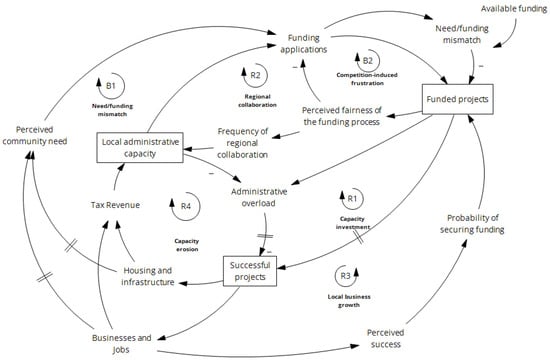 To explore this question, we apply causal loop diagramming (CLD)—a tool from system dynamics that consists of identifying feedback mechanisms driving observed patterns in complex systems [12,13,14]. CLD enables us to model how structural conditions such as administrative capacity, funding design, and collaboration incentives interact over time to reinforce or counteract disparities, informed by secondary data of REDC funding since 2011 as well as interviews with stakeholders. Our study contributes to the sustainability literature in three primary ways: (1) By applying causal loop mapping to the domain of regional economic development funding, we highlight how program design interacts with local capacity and structural constraints, offering a systems-based diagnosis of why certain communities succeed repeatedly in accessing REDC funding while others remain persistently locked out, (2) by integrating public administration theories—such as administrative burden [15], policy capacity [8], and collaborative governance [16]—we link sustainability literature with governance scholarship, and (3) by developing a conceptual model grounded in empirical data, we lay the groundwork for future simulation modeling to test interventions and explore leverage points. In doing so, we build on a growing body of research that uses qualitative system dynamics to uncover feedback dynamics within policy systems [17,18].