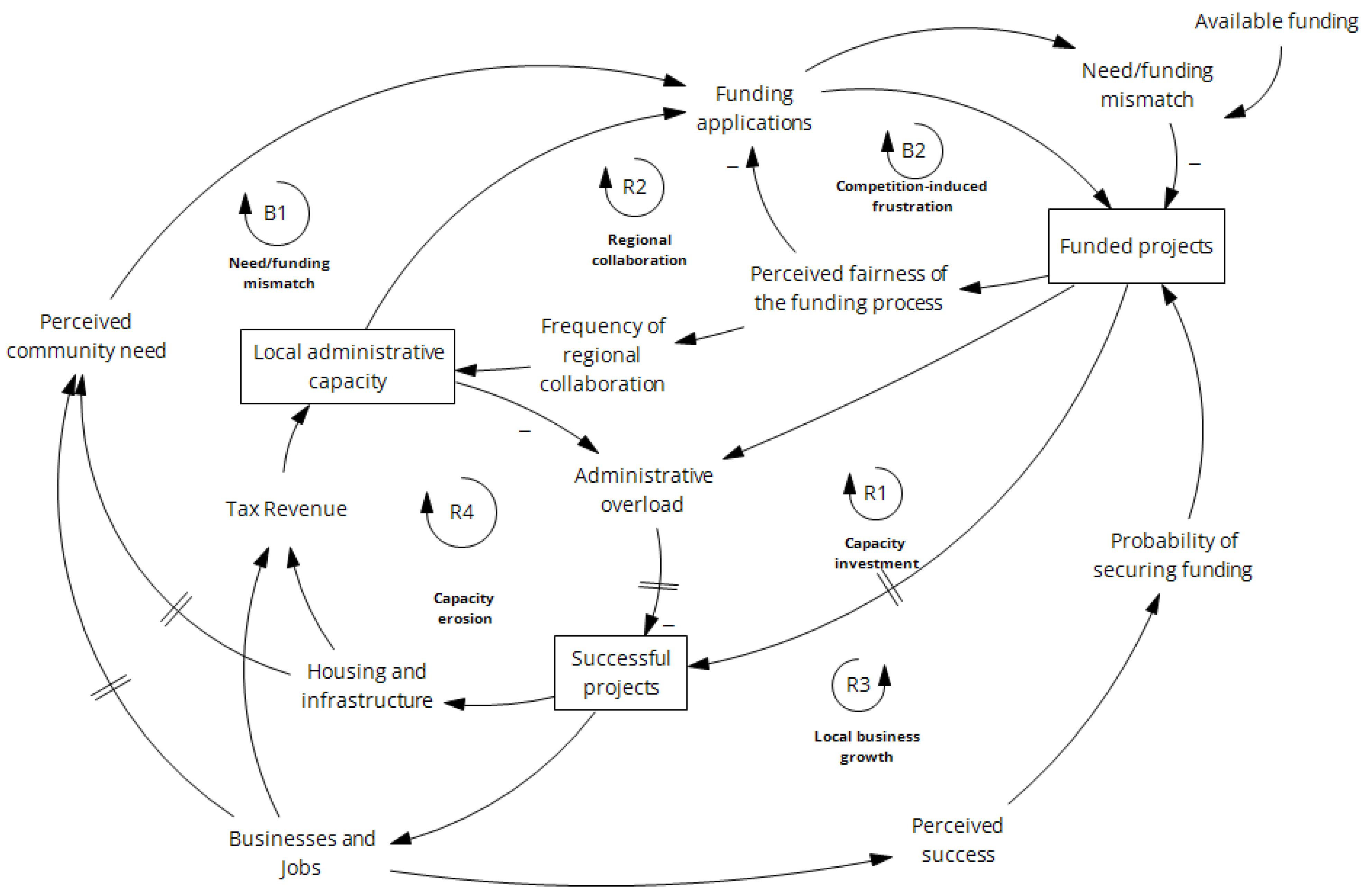 Regional Collaboration & Administrative Capacity Loop (R2): Strong regional cooperation can extend administrative capacity, improving a municipality’s ability to secure funding.