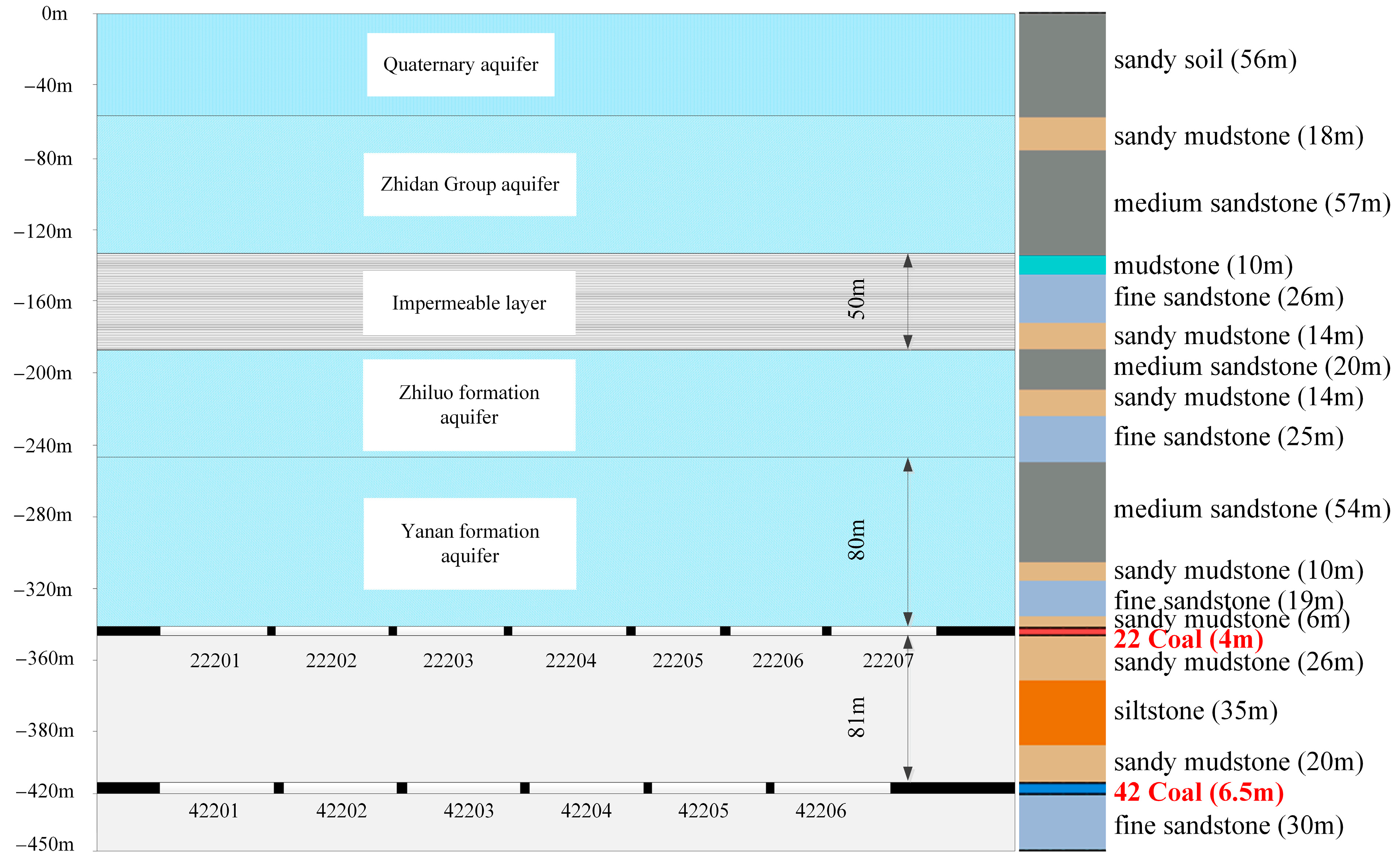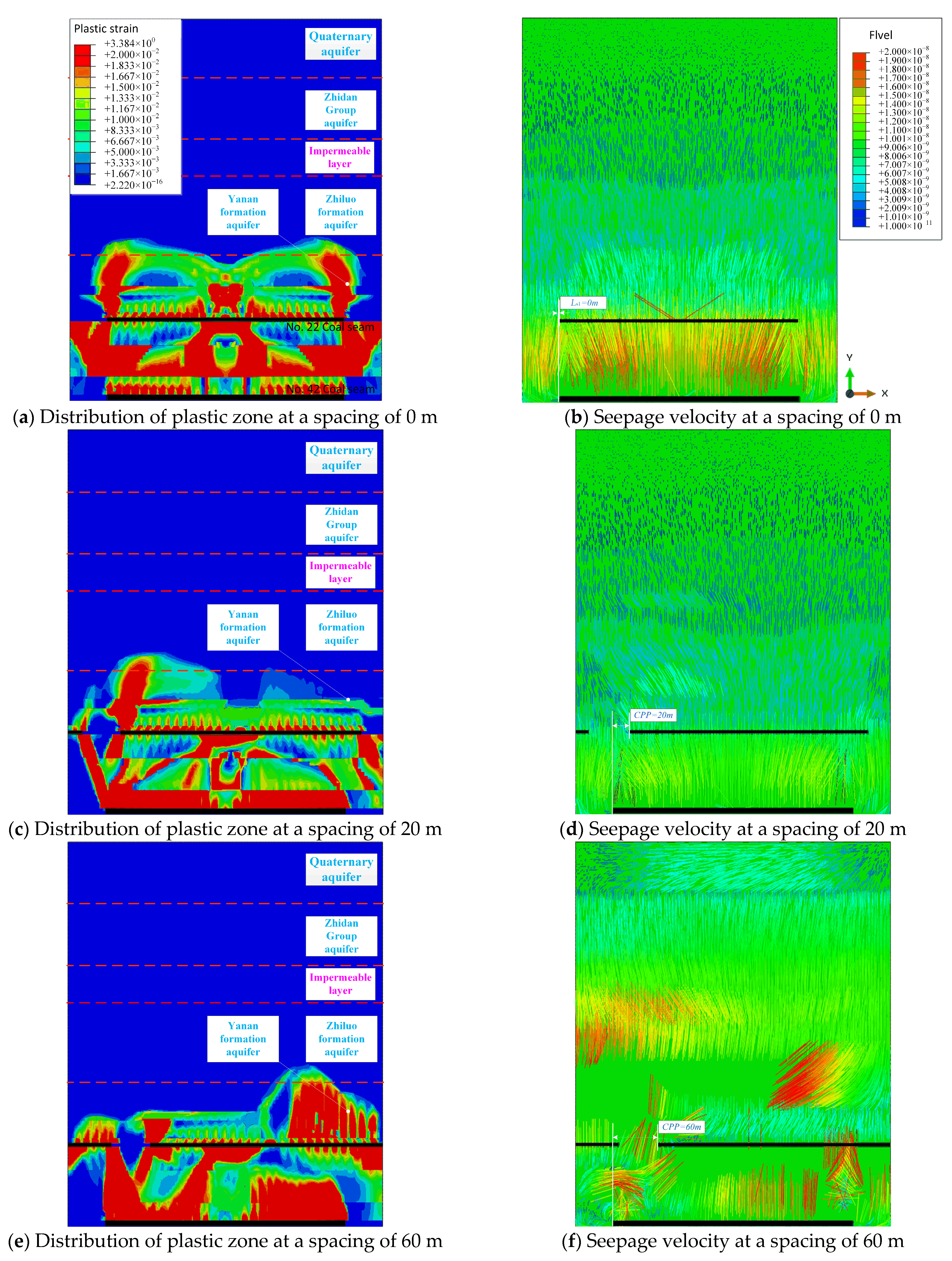 - Optimizing coal pillar layout: Optimizing the arrangement of coal pillars, especially using staggered layouts, can effectively reduce the roof cracking in the Buertai coal mine and significantly lower the underground water inflow in the Buertai coal mine, with a maximum reduction of 26.7%. The aquifer protection efficiency (APE) provides a practical benchmark for green mining design, and optimizing coal pillar layout helps to enhance groundwater protection and reduce the risk of water disasters.
