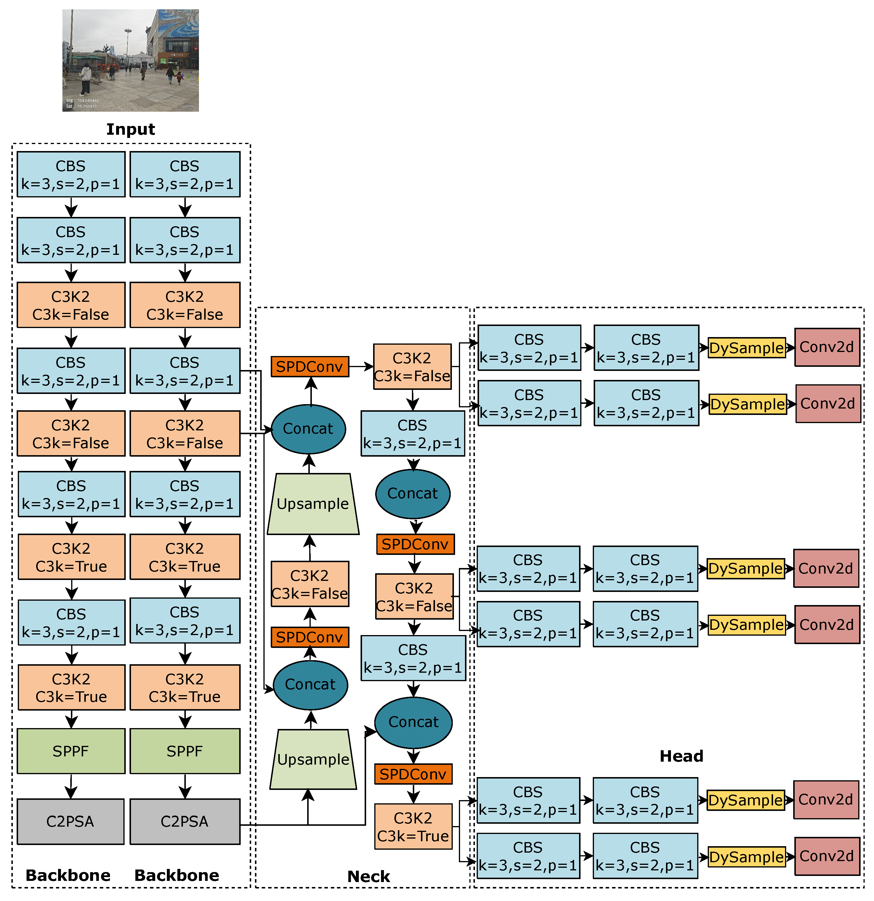 - An Enhanced Detection Model: We introduce an improved YOLOv11-based pedestrian detection model. Its architectural innovations include a novel dual-backbone network for enhanced multi-scale feature fusion, the integration of a SPDConv module to enrich feature representation in complex scenes, and a DySample mechanism within the detection head to improve robustness against severe occlusions.