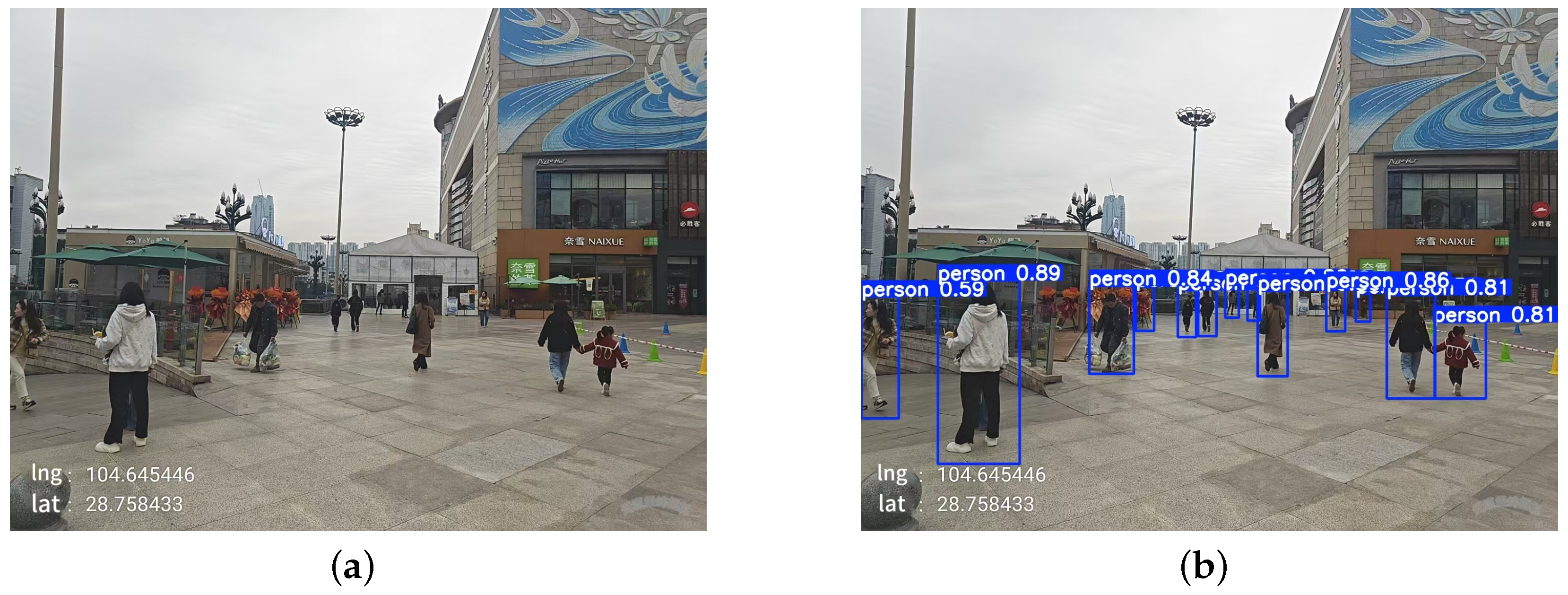- To address the challenges of dynamic occlusion and complex backgrounds in street scene detection, this study incorporates a SPDConv module into the YOLOv11 architecture [29], as illustrated in Figure 7. This module employs spatial restructuring of feature maps to reduce resolution while preserving informational integrity and utilizes parallel dilated convolutions with multiple dilation rates to capture multi-scale contextual features. By integrating a channel attention mechanism, it achieves adaptive fusion of local texture details and global semantic information. This design significantly enhances pedestrian detection accuracy in complex environments without compromising real-time performance, thereby offering a reliable quantitative evaluation tool for urban dynamic monitoring.