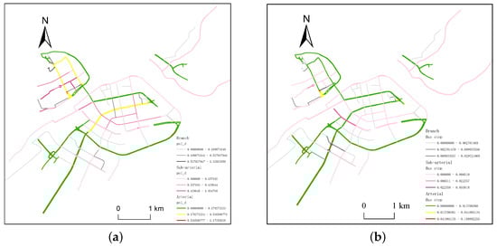 Derived from principal component analysis [36], the composite vitality scores for each street integrate both extrinsic manifestations and intrinsic components of urban vitality. These scores display clear spatial autocorrelation, as shown in Figure 11. High-scoring clusters are mainly located along arterial roads in Xuzhou District and within historic blocks of Cuiping District, reflecting strong commercial activity, improved environmental comfort, and diverse functions. In contrast, streets with lower scores are largely found in emerging and industrial areas, exhibiting a spatiotemporal mismatch where high POI density coincides with low vitality—likely due to traffic congestion or inadequate green infrastructure.