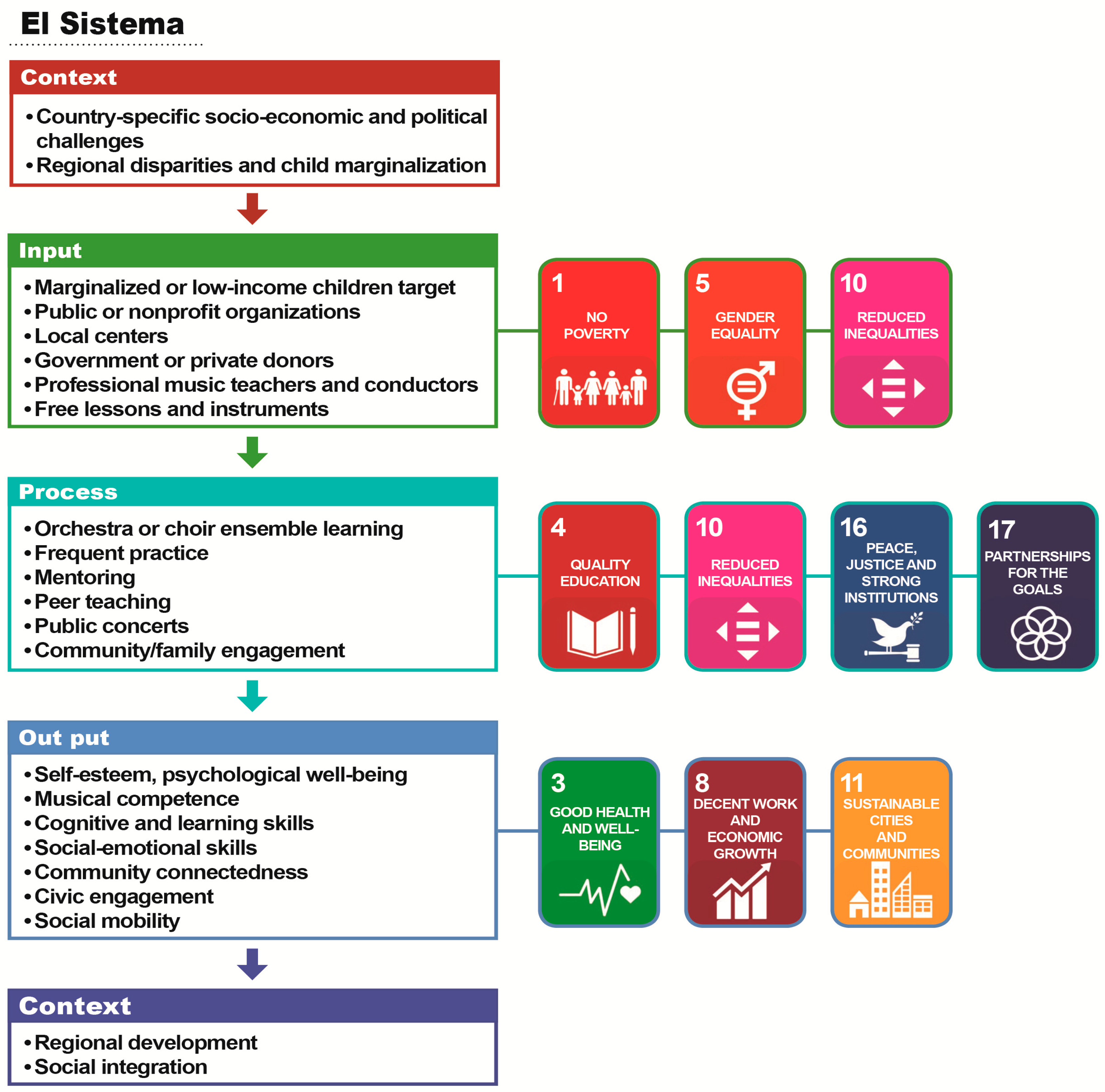 The El Sistema music education system has the potential to contribute to multiple Sustainable Development Goals (SDGs), including SDG 1 (No Poverty), SDG 3 (Good Health and Well-Being), SDG 4 (Quality Education), SDG 5 (Gender Equality), SDG 8 (Decent Work and Economic Growth), SDG 10 (Reduced Inequalities), SDG 11 (Sustainable Cities and Communities), SDG 16 (Peace, Justice, and Strong Institutions), and SDG 17 (Partnerships for the Goals). While the specific objectives, operational strategies, and primarily targeted SDGs of El Sistema may vary depending on the social, political, and economic context of each country, its core mission—to foster positive change for marginalized children, their families, and communities—remains consistent.