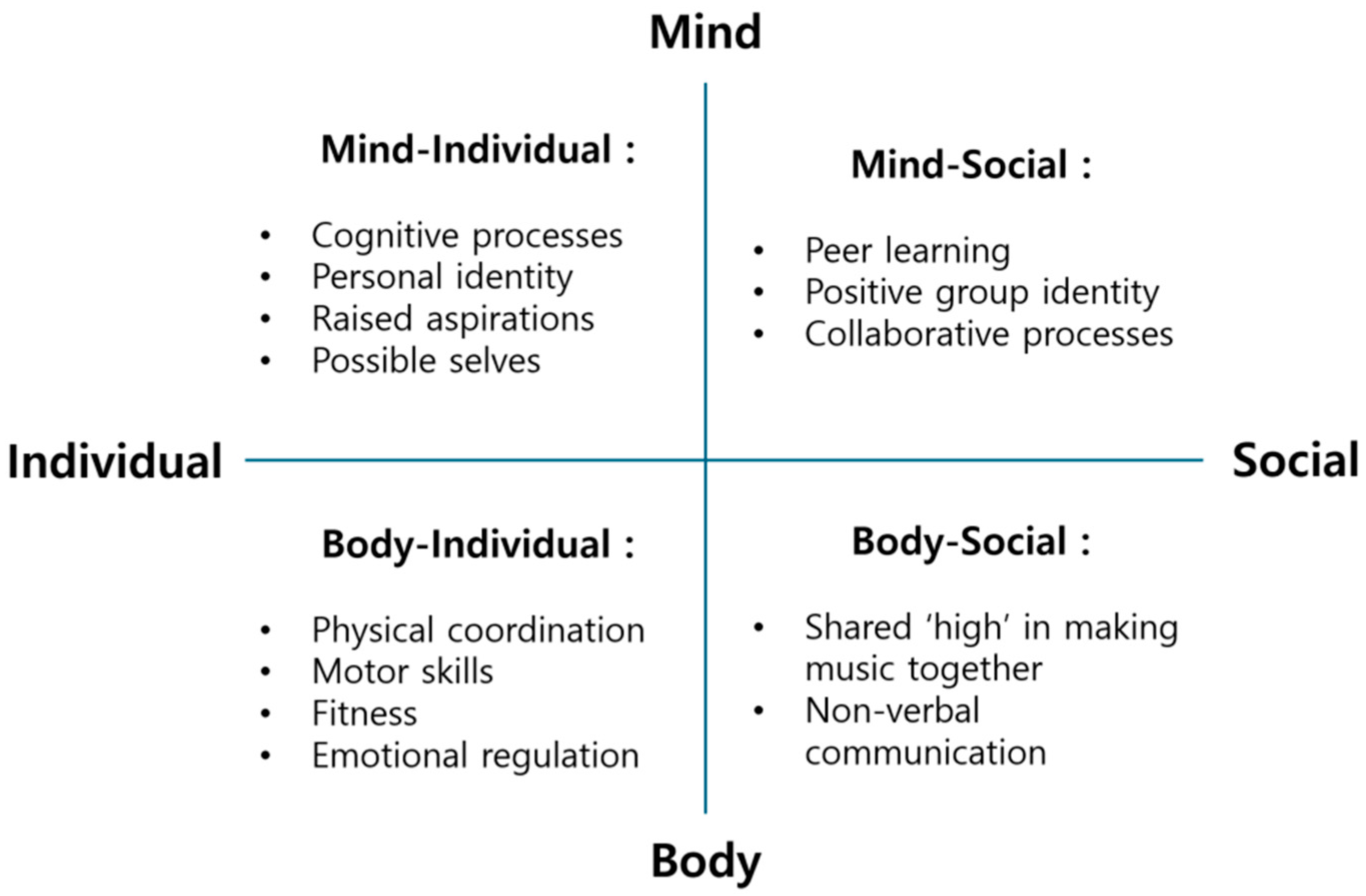 21] indicate that El Sistema positively influences individual health and well-being across four domains: Mind-Individual, Mind-Social, Body-Individual, and Body-Social (