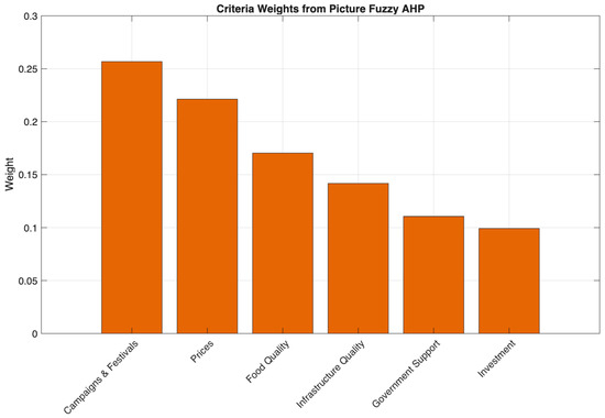 To determine the relative importance of the six criteria, we applied the Picture Fuzzy Analytic Hierarchy Process (PF-AHP). Table 10 shows the matrix that encodes the pairwise comparisons of the criteria using PFNs, where each triplet (μ, ν, π) denotes the degree of support, opposition, and hesitancy toward the dominance of one criterion over another. For example, the first row indicates that “Campaigns and Festivals” is strongly preferred over others, with a membership value of 1.00, which is relatively high when compared to others. This step is critical in aligning the evaluation process with the research objective, which is to prioritize development strategies through a future-oriented and uncertainty-aware methodology. By combining PF-AHP and PF-COPRAS, the study ensures both structured judgment aggregation and robust prioritization under uncertain conditions, contributing to more effective and evidence-based planning in the context of rural food tourism.