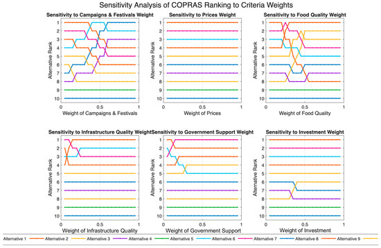 To assess the robustness of the ranking results, a sensitivity analysis was conducted by systematically varying the weights of each criterion. The goal was to identify how changes in the weight of each criterion influence the final ranking of alternatives.