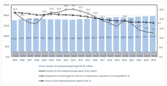 A dynamic analysis of key indicators characterizing employment across 27 EU countries over the past twenty years allows us to draw the following conclusions. Between 2005 and 2024, the number of employed persons aged 20–64 in the EU increased from 176 million to 197 million (+12%), aligning with overall population growth from 434.6 million in 2005 to a projected 450.4 million in 2025 (+3.6%). At the same time, the share of self-employed people among the working-age population declined from 15.3% to 13.2%, despite relatively stable absolute numbers, reflecting labor market changes, such as the expansion of wage employment, tighter business regulations, and the decline of traditional sectors like agriculture. The proportion of NEET youth (aged 15–24) dropped significantly from over 16% in 2013 to 11.1% in 2024, largely due to targeted EU policies in vocational education, youth employment initiatives, and improved access to training (Calculated based on the data: []). These dynamics indicate a gradual shift toward more inclusive, formalized, and skills-oriented labor market structures, which supports the achievement of SDG indicators (Figure 1).