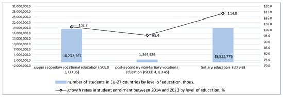 Number of students in EU-27 countries by level of education in 2023 and growth rates in student enrolment between 2014 and 2023 *. * Calculated based on the data: [,].