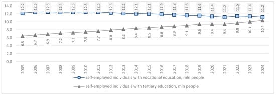Studies indicate that a proportion of individuals with vocational education pursue self-employment (Figure 3). The technical skills acquired enable them to work in various sectors, including beauty services, construction, crafts, and agriculture. Over the past two decades, the number of self-employed individuals with vocational education has remained relatively stable, whereas the number of self-employed individuals with higher education has increased by more than 1.5 times. Individuals with higher education are more likely to engage in intellectual self-employment, such as IT, consulting, design, and marketing. Therefore, the level of education has a significant impact on the nature of self-employment; however, this impact is not always straightforward and depends on labor market trends, work motivation, and local characteristics.