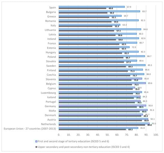 The SDGs are oriented towards increasing youth employment levels, particularly by reducing the proportion of young people who are neither employed, in education, nor acquiring professional skills. A comparative analysis of employment rates within three years after completing formal education indicates that graduates with higher education exhibit higher employment levels compared to those who completed vocational and technical education (81.8% versus 69.3%). In certain Eastern European countries (e.g., Bulgaria and Romania), the lack of strong employer integration means that training in vocational and technical institutions does not necessarily enhance employment opportunities. Furthermore, a persistent bias exists whereby obtaining an academic degree (bachelor’s or master’s) is perceived as more valuable and more conducive to career advancement than vocational qualifications.