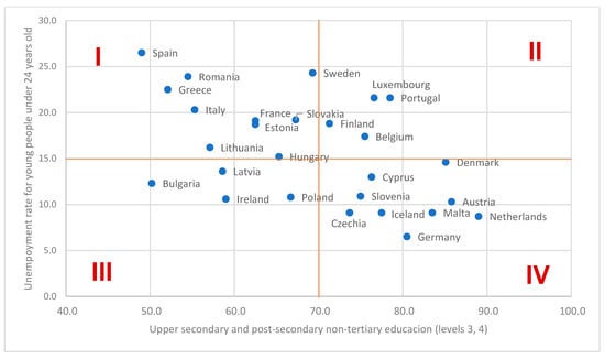 Research also indicates that in countries with well-developed dual education systems, youth unemployment rates (under the age of 24) are significantly lower, as employers are more willing to hire individuals with practical experience or those who have demonstrated their abilities during internships (Quartile IV, Figure 5) []. In contrast, the highest youth unemployment rates are observed in countries with a low level of dual education implementation, including Greece, Italy, Lithuania, Latvia, and Bulgaria (Quartiles I–II, Figure 5). According to OECD findings, only about 15% of vocational education students in Bulgaria, Latvia, and Lithuania are enrolled in dual education programs, whereas in Italy this share is below one-third [].