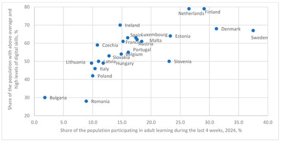 Studies have demonstrated that adult learning participation is not correlated with GDP per capita but rather shows a strong relationship with the level of digitalization. In countries with the highest levels of lifelong learning—such as Sweden (37.5%), the Netherlands (26.5%), Finland (29.1%), Denmark (31.2%), and Estonia (23.3%)—the population also exhibits the highest and above-average digital skills, as illustrated in Figure 6.